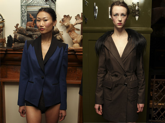 The palette used here focuses mainly on rich blues and black– including a jacket with chain detailing, based on their White Raffia Jacket, which will be brought back by popular demand from last season. This collection includes trench coats, a leather “biker inspired” jacket, dinner jackets, and a beautiful blue tuxedo jacket (my personal favorite piece from the collection). Other creative embellishments include a buckle (made by an atelier in Brooklyn) and a wax cotton parka designed with a removable goat hair collar and hood. Kudos to the designers also on their choice of materials, each garment feels as high-end as it looks.