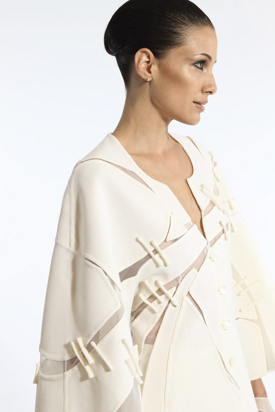 Consummate, this single word describes both Ralph Rucci and his art. Ralph Rucci’s designs possess a refined and serene feel to them. They are perfectly balanced, not solely aesthetically but in spirit as well. Viewing the Spring 2011 collection from Chado I felt as if I was reading almost as much as seeing. There was communication occurring, each dress, each jacket, each blouse was imparting a specific message. Fundamental sections such as panels and sleeves carried the same strength as the detailing, creating a sense of wholeness you rarely encounter in fashion. Mr. Rucci creates garments much like a master calligrapher who understands that the form of the symbol communicates as much as the symbol itself.