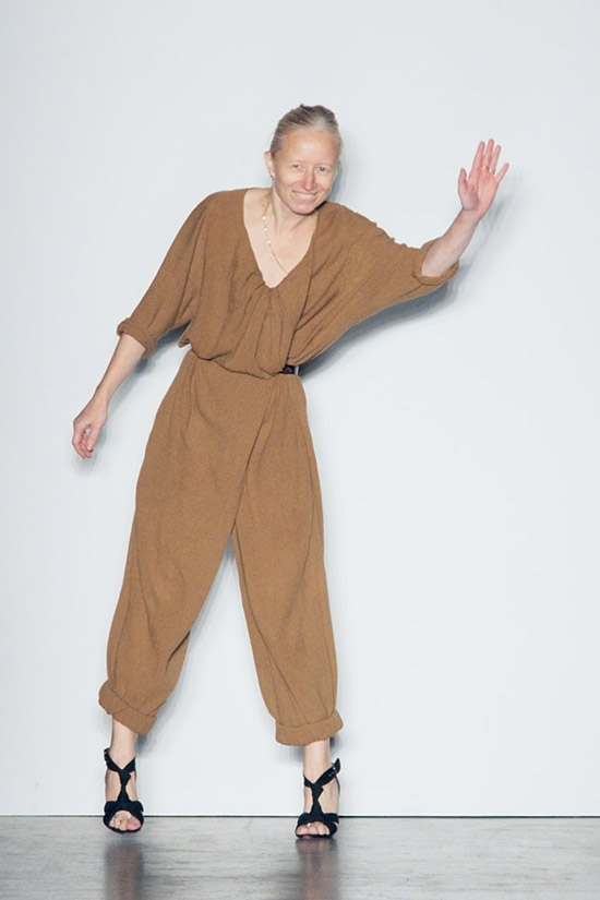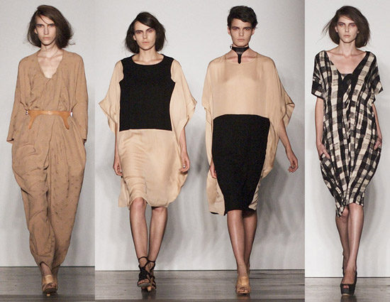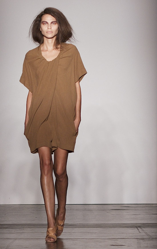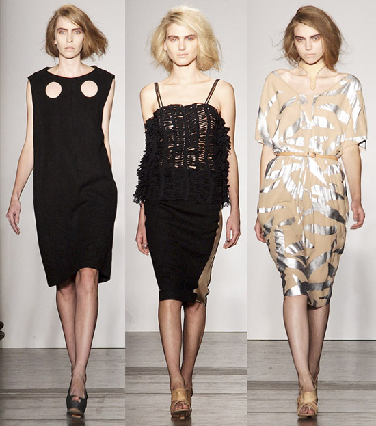 A Détacher is known for it’s prints and the Spring 2011 collection should increase that reputation. The prints themselves are intriguing; dark and rich colors with patterns that play on the edge of randomness and geometry. Often with A Détacher though, it’s how Ms. Kowalska cuts up and places the prints that fascinates. On one of her many exquisite jumpsuits a black and pale gold print creates a near hypnotic effect that makes one try to make sense of its potential randomness or structure. A short sleeve dress with a deep neckline is created in a faded checked pattern that looks worn in spots yet fresh in others, uneven and yet symmetrical. The three showstopping pieces were a pair of nude and black dresses that were colored to oppose each other and walked side by side and a compelling black sheath dress with two simple circles cut out between the neck and breasts. The decisions that Ms. Kowalska makes when creating a garment seem rooted in a deep understanding of what will draw the eye in a nontraditional way.