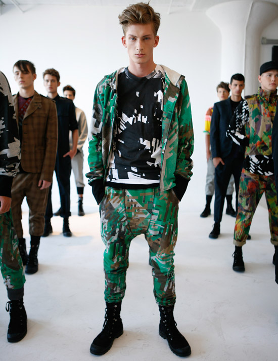 Combining Lee’s masterful design and tailoring skills with Ben’s graphic/psychedelic prints, styled for the presentation in black half boots, there are strong cuts and spikes of fluorescent color everywhere, like graffiti fatigues. Taken together, it reminds of the documentary footage showing British soldiers trying to perform a military exercise after ingesting LSD…
