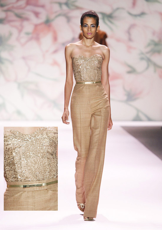 To say the collection was floral-based is to do an injustice on the scale of, “the ocean has some water in it.” It was one of the great gardens of the world come to life, each beautiful piece compelled one farther and farther down the turning path. The lushness of the swirling scene was surpassed only by the scrupulous attention to detail. On a stunning blue and green, sweetheart cut topped gown, each piece of petal shaped silk was lightly scalloped to create more eye pulling complexity. Even on some of Ms. Lhuillier’s “simpler” pieces, there lived a level of meticulous sophistication which again speaks to her imagination. A pair of perfectly cut linen pants possessed an angled opening for front faced pockets which created the illusion of an extra panel. And the material was so sheer that the color of the skin from the model’s legs actually created an extra tone which flirted with the surface as she strode down the runway. Vision in the grand sense is a wonderful quality to possess but it will not create brilliance without the discipline to execute perfect details.
