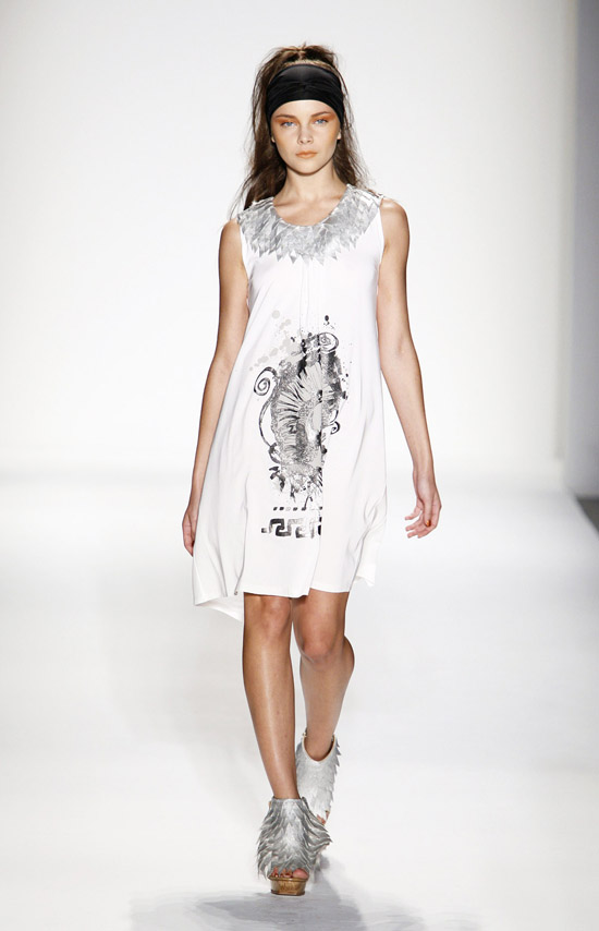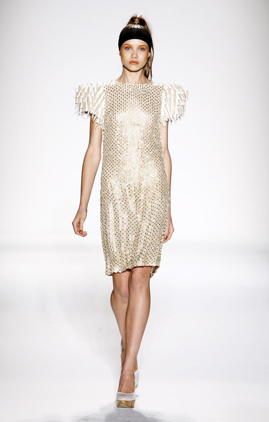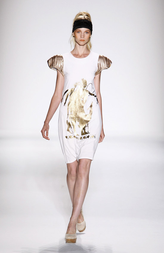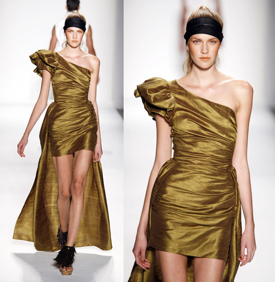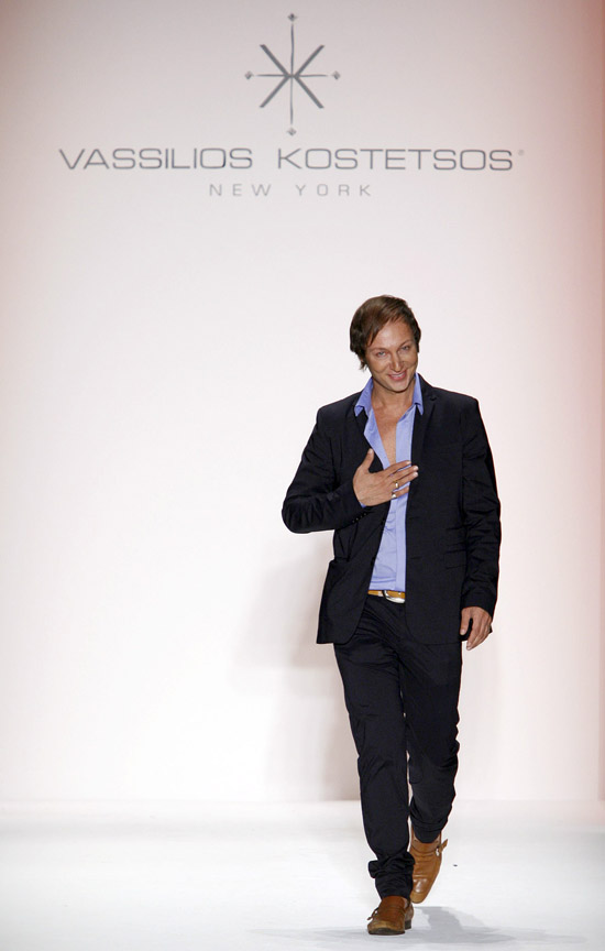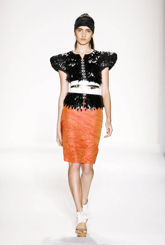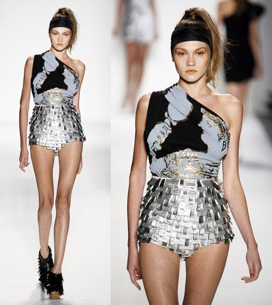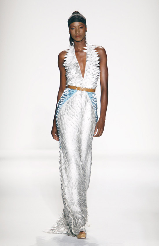 It’s important to say that Mr. Kostetsos has a couturier’s skills. His diverse businesses include everything from sports wear to full bespoke couture. He is another of those rare fashion artists who is gifted with the ability to create anything and everything that comes to mind. His Spring 2011 was for the most part a very dramatic collection. The collection was inspired by antiquity but was distinctly modern. One of the touches that flowed throughout the show was the repeated use of materials cut like triangle scale mail. This gave the collection the bulk of its historical feel. Mr. Kostetsos also used Greek urn prints and the expected Greek keys. The colors for his season were drawn on an Aegean palette; brilliant blues, whites, oranges, silvers and just a touch of black for evening. For the most part the collection was given strong definition by very aggressive and sexy cuts and warrior touches such as the “mail” and shoulder crowns. Overall Mr. Kostetsos seems to be designing for a client who enjoys turning heads, this was a far from conservative effort, which made the best looks (about a dozen or so), when taken together fairly enjoyable.
