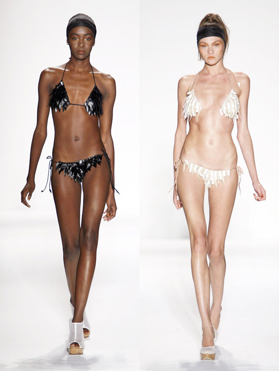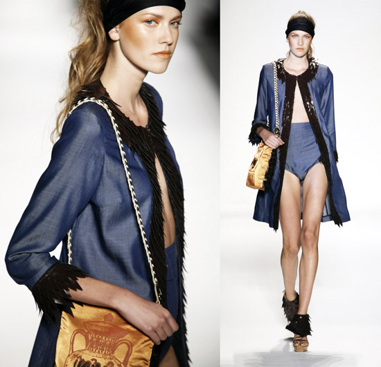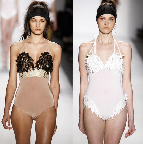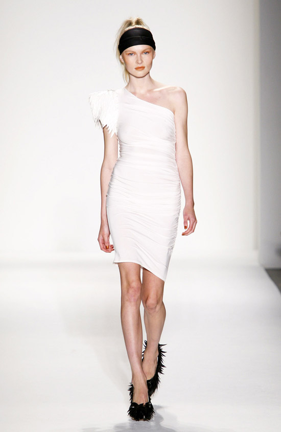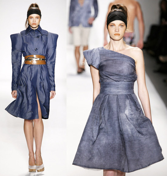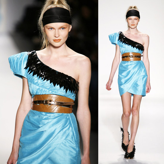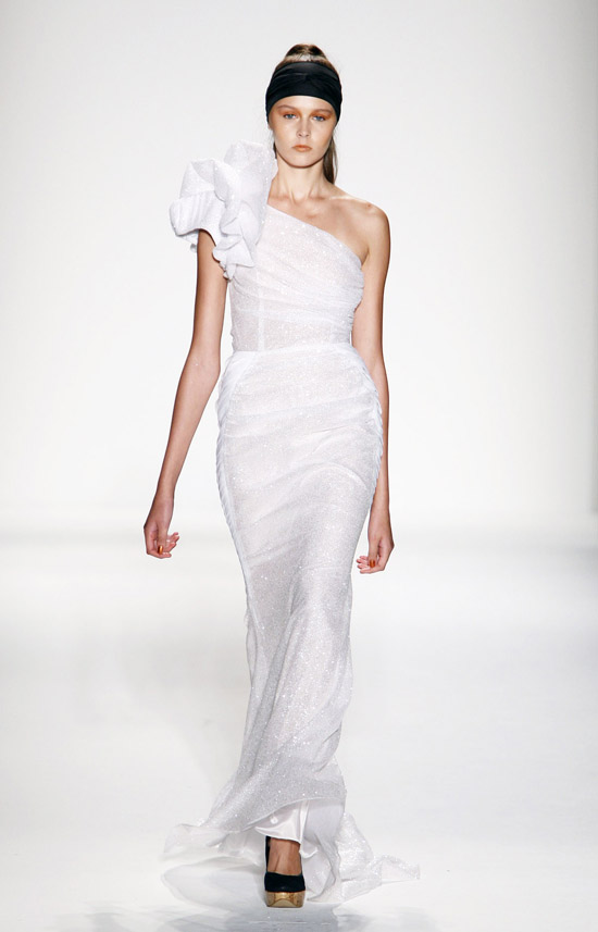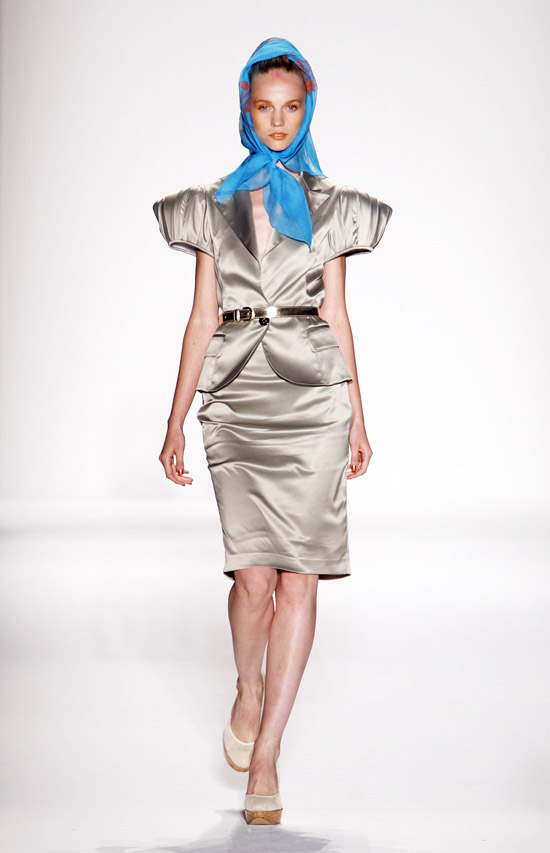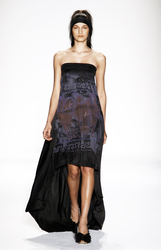 It’s important to say that Mr. Kostetsos has a couturier’s skills. His diverse businesses include everything from sports wear to full bespoke couture. He is another of those rare fashion artists who is gifted with the ability to create anything and everything that comes to mind. His Spring 2011 was for the most part a very dramatic collection. The collection was inspired by antiquity but was distinctly modern. One of the touches that flowed throughout the show was the repeated use of materials cut like triangle scale mail. This gave the collection the bulk of its historical feel. Mr. Kostetsos also used Greek urn prints and the expected Greek keys. The colors for his season were drawn on an Aegean palette; brilliant blues, whites, oranges, silvers and just a touch of black for evening. For the most part the collection was given strong definition by very aggressive and sexy cuts and warrior touches such as the “mail” and shoulder crowns. Overall Mr. Kostetsos seems to be designing for a client who enjoys turning heads, this was a far from conservative effort, which made the best looks (about a dozen or so), when taken together fairly enjoyable.