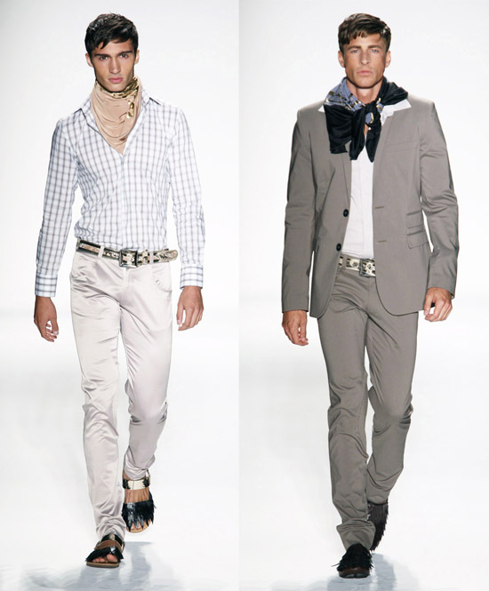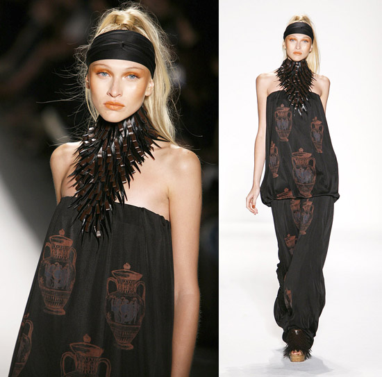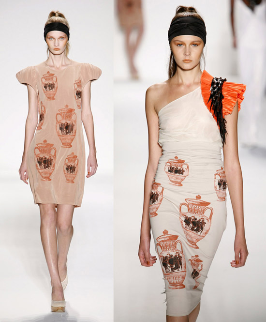 When an artist’s inspiration is a bygone era or an exotic culture it will almost always result in a collection that feels dramatically different. To reach into the past or draw on a largely unfamiliar land is to guarantee initial interest in the fashions that are striding down the runway. Holding attention and drawing buyers, press, and fans deeper into the season’s offerings is another matter entirely. Themes are a tricky business, being inspired and becoming passionate about antique or unknown artistic elements is a heady trip for a fashion designer. Knowing when to stop using or referencing a transfixing this or a hypnotizing that requires self discipline. For his Spring 2011 collection Vassilios Kostetsos mixed Greek history with the beauty of the colors and climate of Mediterranean life for an ensemble of fashions that when they were good were very good but when they were ordinary were too much.