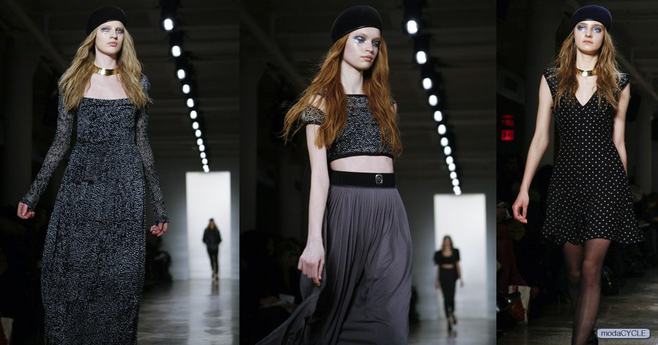 The Fall 2011 Vena Cava collection by designers Sophie Buhai and Lisa Mayock was a fun show. They gave all the guests a copy of ‘Zina Cava, a pre-Internet style homemade fashion magazine. The designers met when they were 17 in California, and it was something they had in common early. There was nothing juvenile about the collection they showed on the runway though. There was good movement and a gliding appearance to the first look and then came slick leathers, hot high-waisted midriffs, slinky sultry long dresses, creative cutouts and criss-crosses, and very strong forms in the shoulder area on many looks. Many of their garments are tight on the torso and hips, the sort of dresses and pants that lend appropriate framing to a commendable posterior on a confident woman. There were subtle lines and patterns on a lot of looks, but they gave emphasis to the forms rather than overriding them, they were submissive to the cuts. Overall a very nice flow and some great outfits from Vena Cava this season.