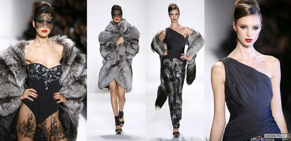 Farah Angsana’s Fall 2011 collection was not for the meek. They never are, but this season had an even more defiant feel to it. Her clothes are for rich extravagant party girls who make no apology for the fact that they are rich extravagant party girls. Embroidery has always been one of Mrs. Angsana’s signatures, but embroidery itself is not all that uncommon amongst luxury clothing designers. What makes her work shine out and on is that she edits it perfectly. Her gowns and dresses never become overburdened with adornments and never come across as garish. The early part of the collection was dominated by blacks and silvers, which fits in perfectly with what you expect from a Farah Angsana collection. The end of the collection found her toning down the fancy needlework a bit and letting a beautiful series of blues, purples, browns, and a dash of red carried her message of bold glamor in beautiful luxurious fabrics. The show-stopping white ethereal gown with feather piping caused the crowd’s pulse to quicken and brought perfect closure to a solid collection. When you’re out at the palace this fall and the sight of a girl glittering and shimmering makes you go a bit weak in the knees, strong chance Farah Angsana gave her a helping hand.