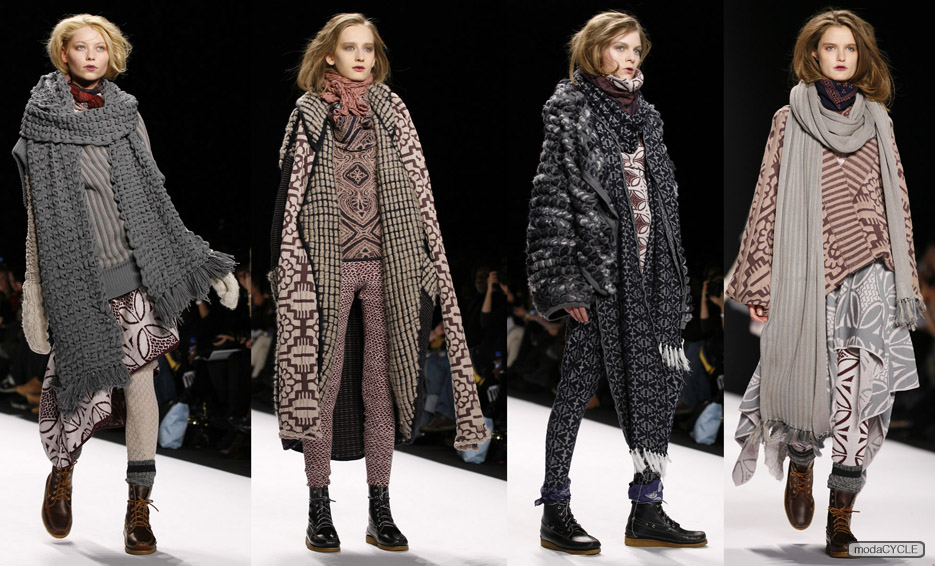 Nude and black, Aura Taylor designed a collection that used only two colors. She wowed us with her great understanding of structures and lines and amazing tailoring skills. Minha Yoon’s collection also used limited colors in her collection. Inspired by the effect of light and shadows, she created a collection that was sexy and elegant with a little uniform sex-appeal. Designer Holly Smith got her inspiration from a diving water bird and made a collection that recreated its movements. Each of her looks was in a solid color, including a standout black wool jersey dress with black leather coat. She created some sophisticated clothes with great tailoring.