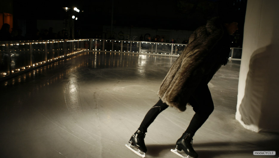 Her collection’s futuristic feel juxtaposed with the ice rink, and together they seem kind of strange but surreal in a way. Yet, the surrealist thing of the night was seeing world-class figure skater Johnny Weir skating in Øverland’s design, a long silver robe trimmed in black fur, which was Øverland’s favorite of this season. Elise Øverland totally gave us a show like no others, and her collection? Definitely has become cooler and cooler each season.